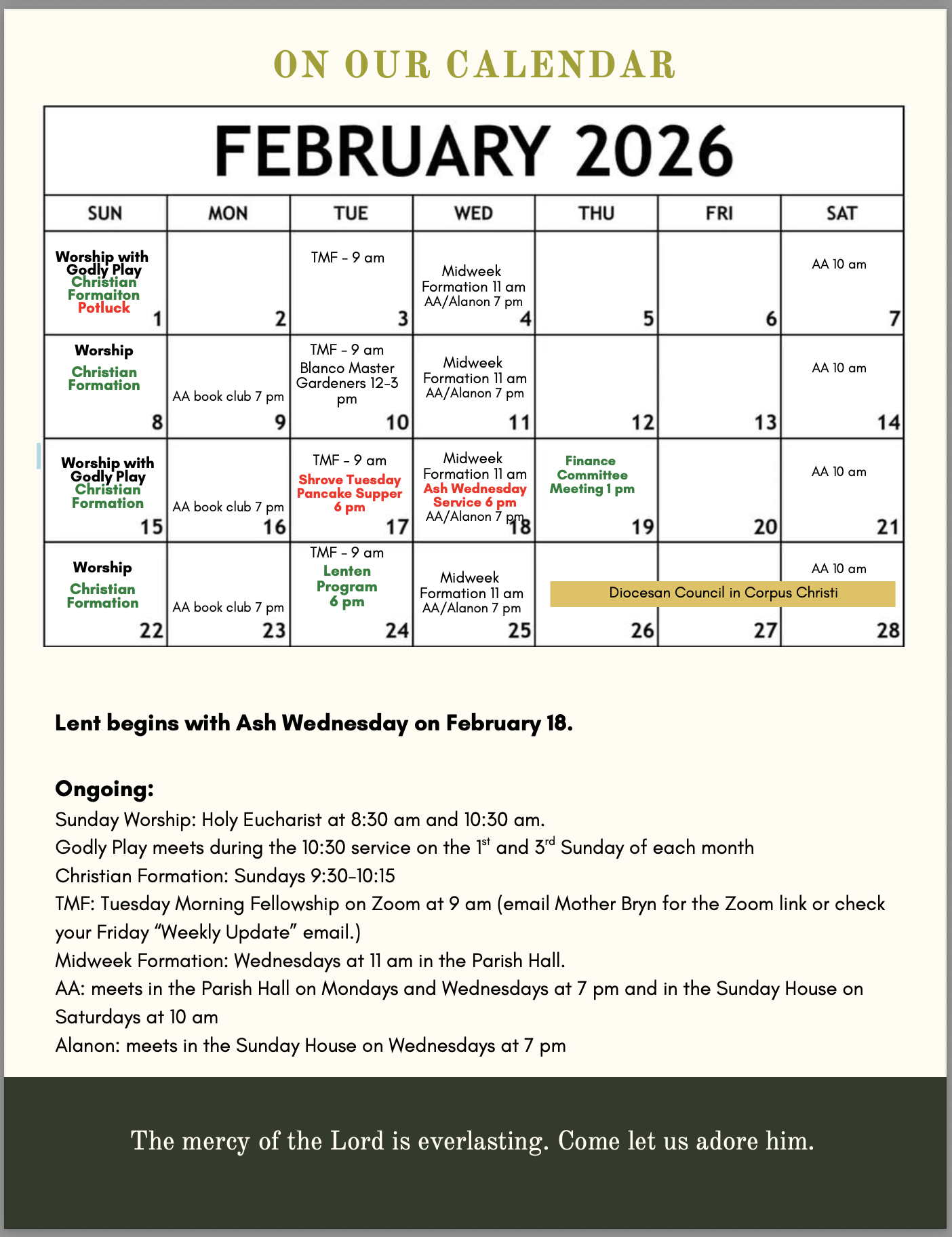 St. Michael’s 2026 Bishop’s Committee - (front row) - the Rev. Bryn Caddell, Ginger Faught, Liz Tschoepe, (second row) Aylin Snodgrass, Steve Kumbalek (Junior Warden), Jody Wright (Bishop’s Warden), Larry Seiler (Treasurer), Hardwick Bieri, John DeCecco